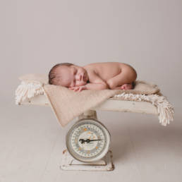 Newborn sessions typically last about 1.5 hours and result in 50-75 unique images documenting all your baby’s tiny perfect details and the fleeting newborn period. Babies are photographed posed on a beanbag, in their parent’s hands, with siblings and family members, with vintage and antique props, and with the family dog (if desired). Siblings, parents, and grandparents are all encouraged to participate.